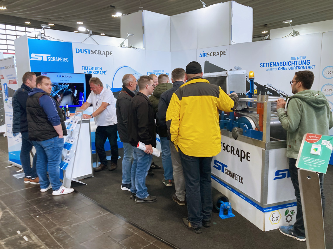 ScrapeTec, die Entwickler innovativer Staubschutz-Lösungen für Übergaben an Förderanlagen, waren auch auf der diesjährigen SOLIDS in Dortmund wieder dabei. Am 29. und 30. März empfingen sie an ihrem Messestand, wie auch zuletzt auf der bauma, eine Vielzahl an Interessenten. Im Mittelpunkt stand diesmal der DustScrape, eine in Bandlaufrichtung vor der Schurre platzierte Filtereinheit, die in Kombination mit der innovativen Seitenabdichtung AirScrape und der Heckabdichtung TailScrape den sonst anfallenden Staub effektiv auf nahezu null reduziert. Zur der bisherigen, mit Filtertuch gekleideten Tunnellösung stellte ScrapeTec das robustere Upgrade in Kastenform vor. Diese Staubschutz-Lösung hat einen betriebswirtschaftlich bisher kaum beachteten Effekt: Staubabsaugungen an den Betriebsstätten können dank der Wirksamkeit der Lösung abgeschaltet werden. Heißt: Die hohen Energiekosten für den Betrieb der Entstaubungsanlagen lassen sich immens reduzieren. Die hohe Nachfrage nach solchen Staubschutz-Lösungen zeigte sich an der Besucherzahl am Stand. Neben dem hohen Anteil an Interessenten aus dem Binnenmarkt waren auch Partner von ScrapeTec aus Indien oder Brasilien anzutreffen. „Wir waren von dem Besucheransturm mal wieder begeistert und konnten viele neue Kontakte knüpfen. Zudem kamen auch bestehende und sehr zufriedene Kunden aus Deutschland mit Kollegen, also Verantwortlichen von anderen Förderanlagen des Unternehmens, damit diese die Wirkungsweise unserer Lösungen aus erster Hand von uns erklärt bekommen,“ so Thorsten Koth, der bei ScrapeTec den Vertrieb verantwortet. Auch wenn am Messestand von ScrapeTec Null Staubaufkommen zu verzeichnen war, ein kühles Bier wurde von Besuchern neben den interessanten Informationen ebenfalls gern genommen. Bleibt abzuwarten, ob ScrapeTec nun auch im heimischen Markt mehr nachgefragt wird. Die Besucherzahlen am Messestand von ScrapeTec im Rahmen der SOLIDS lassen darauf schließen. Letztendlich ist das Unternehmen mit seinen Produkten mittlerweile weltweit mit seinen Staubschutz-Lösungen im Einsatz, deren Effektivität international überzeugt.