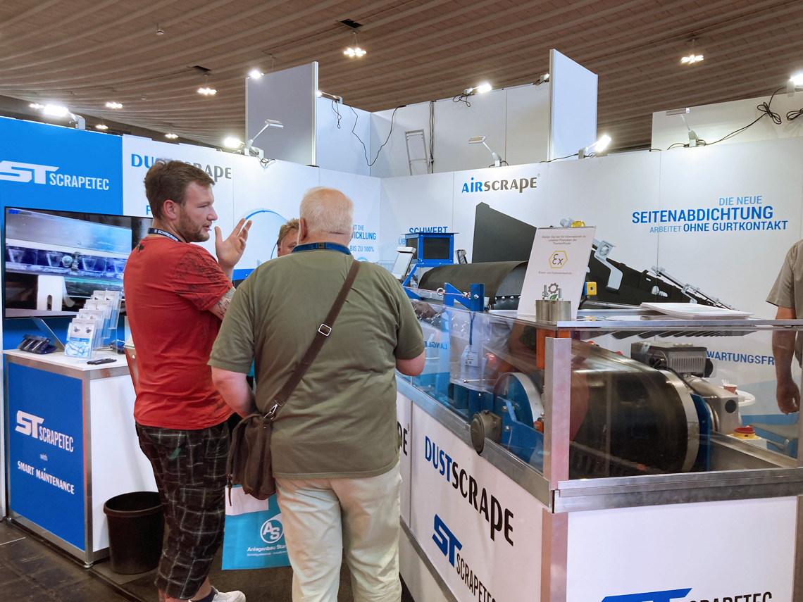 Dortmund, SOLIDS from June 22-23, 2022, booth B12-4. The accumulation of visitors in front of the ScrapeTec booth led to the assumption that free beer was being offered here. In fact, the rush was due to interest in the innovative products that ScrapeTec is known for. Solutions that come from “out of the box” thinking. Wilfried Dünnwald, company founder and owner, demonstrated all innovative products and their interaction to the visitors on a running model. ScrapeTec showed its competence for dust protection solutions for everything related to the transfer to conveyor belts – including the AirScrape®, the innovative and non-contact conveyor skirting system. And the latest development, the PrimeTracker: a conveyor belt tracking guide roller that corrects the belt quickly and easily so that it always runs in the middle. The advantages: no wear, immediate response to misalignment situations and easy installation in existing systems – also suitable for reversible belts. The demand at the fair was high and the stand was more than well attended. Finally, information about the products and their mode of action was obtained first-hand from the inventor Wilfried Dünnwald. The former mining engineer in “unretirement” was able to serve the questions and needs of interested parties in the best possible way. The topic of cost reduction through intelligent solutions in this area of conveyor systems also attracted a great deal of interest. At the booth, the advantages of being dust-free, the reduced contamination of the system components and the maintenance-free solutions from ScrapeTec were moderated in an economically comprehensible manner. The acceptance of this topic was high, as many companies feel compelled to rethink against the background of the current European challenges. The presence of customers who reported satisfied practical experiences with the ScrapeTec solutions already in use was a real benefit for many visitors. The result was many inquiries. ScrapeTec owner Wilfried Dünnwald and sales manager Thorsten Koth are now looking forward to POWTECH from August 30th to September 1st. in Nuernberg and the BAUMA from October 24th to 30th, 2022 in Munich. In Munich at the latest, they will present another innovation: the E-PrimeTracker.