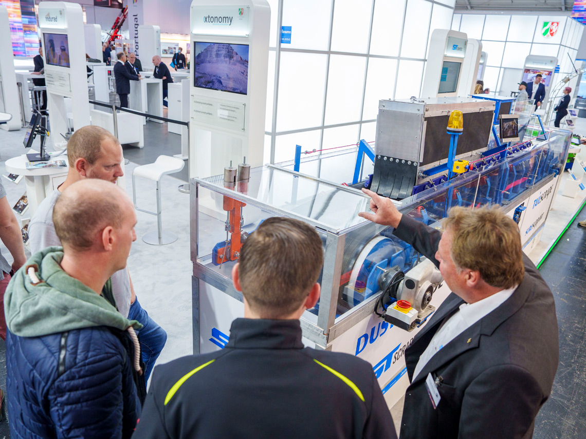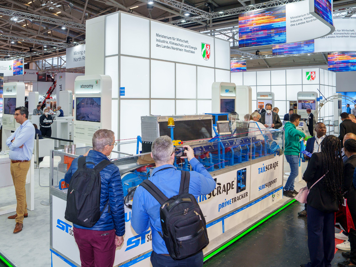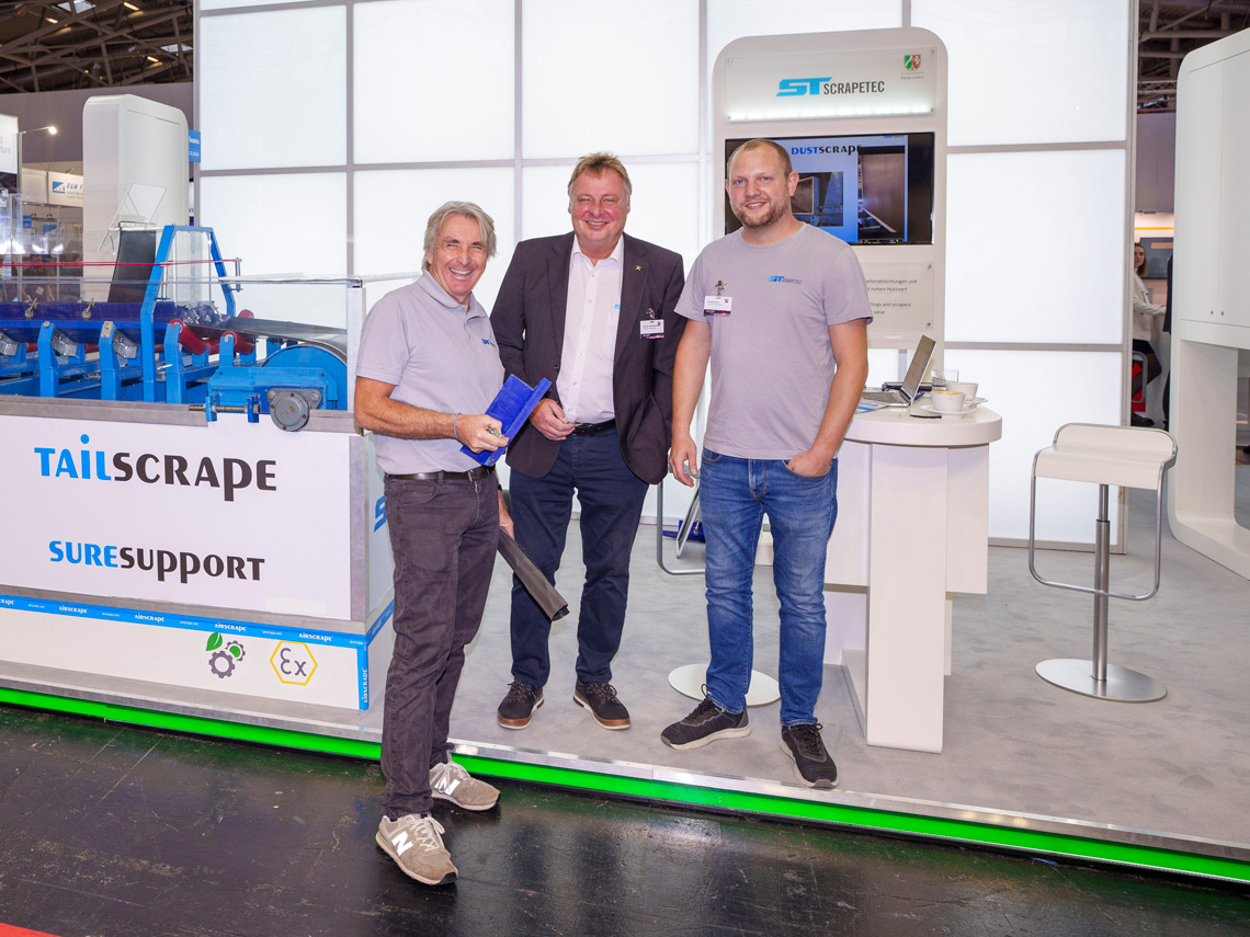 With the sensory equipment and the monitoring suitability, ScrapeTec serves exactly this change, which is also noticeable in the area of conveyor systems for bulk goods. Even if ScrapeTec Trading GmbH was part of a joint stand for the mining competence of the state of North Rhine-Westphalia at bauma, the advantages of the solutions for dust protection are recognized across all sectors. They concern conveyor systems for any material. And with the presented E-PrimeTracker, the company around developer Wilfried Dünnwald has once again proven its innovative strength. Also for the future. Because the app belonging to the E-PrimeTracker, to allow mobile monitoring, was presented at the bauma as a prototype in the example system of the stand. The final market launch will follow soon. The demand is high, which was also shown by the large number of visitors to the ScrapeTec stand.