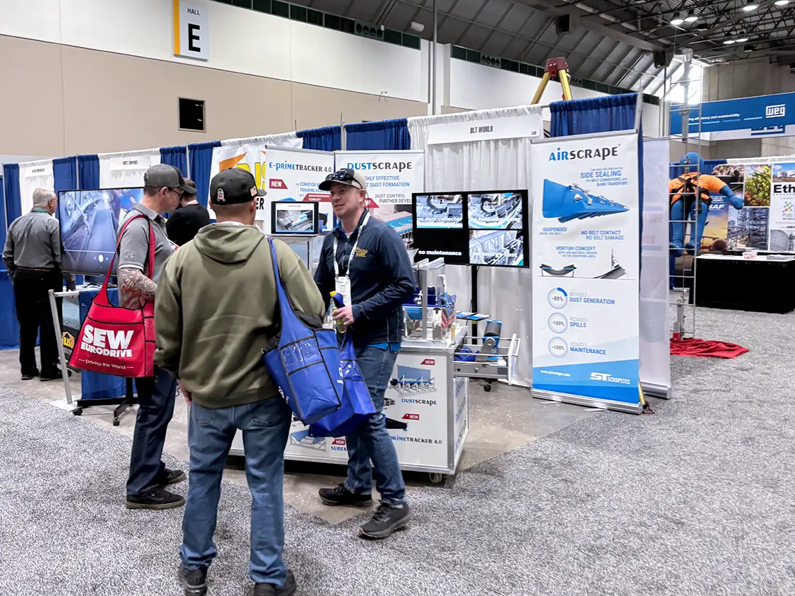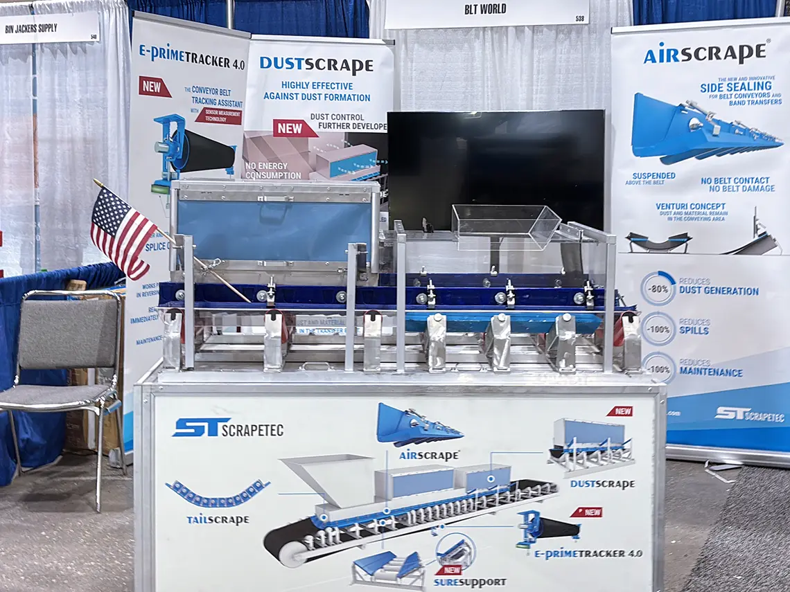 At the trade show, ScrapeTec showcased advanced solutions for dust reduction and operational safety—focusing on the AirScrape®, an innovative and patented contactless side sealing system for transfer points.