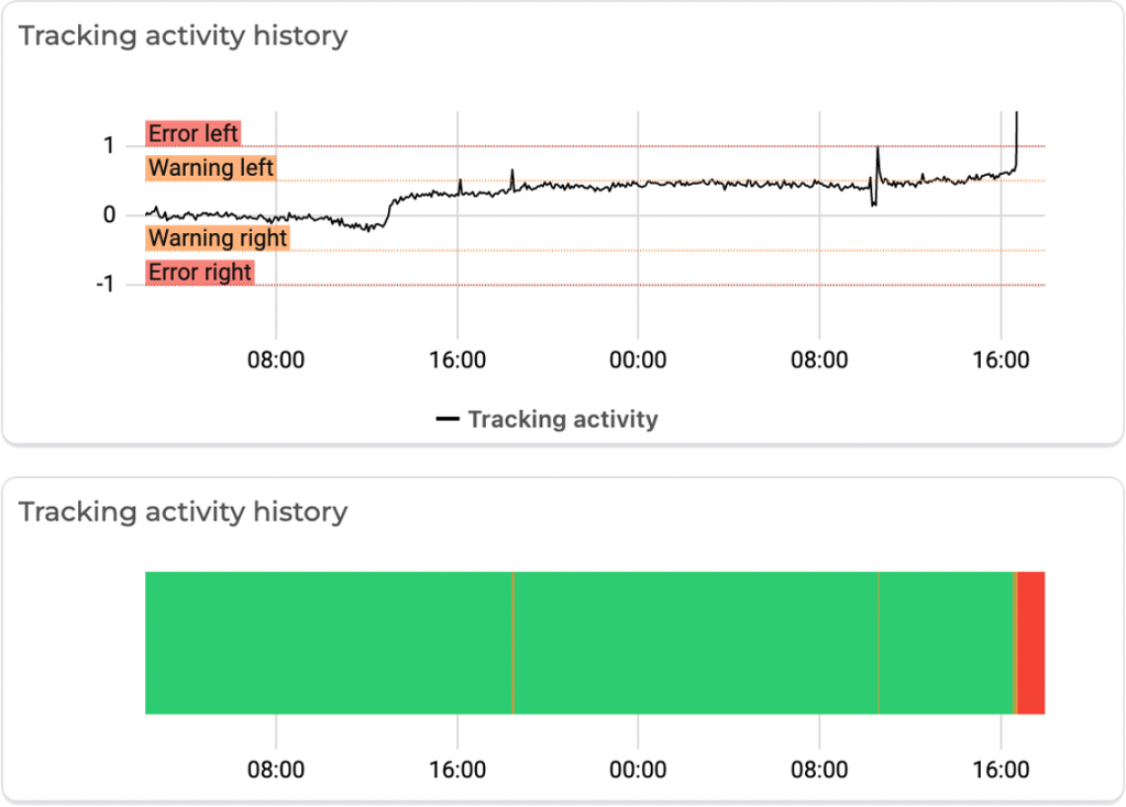 Sensors integrated into the E-PrimeTracker detect the position of the tracker and therefore the status of the belt operation. The detected state is displayed directly on the device through a light signal. Based on the displayed colors of green, yellow, and red, employees can recognize the condition of the belt operation and respond to any fluctuations in alignement (yellow). The red warning signal indicates that immediate inspection is necessary to avoid any belt damage or downtime.