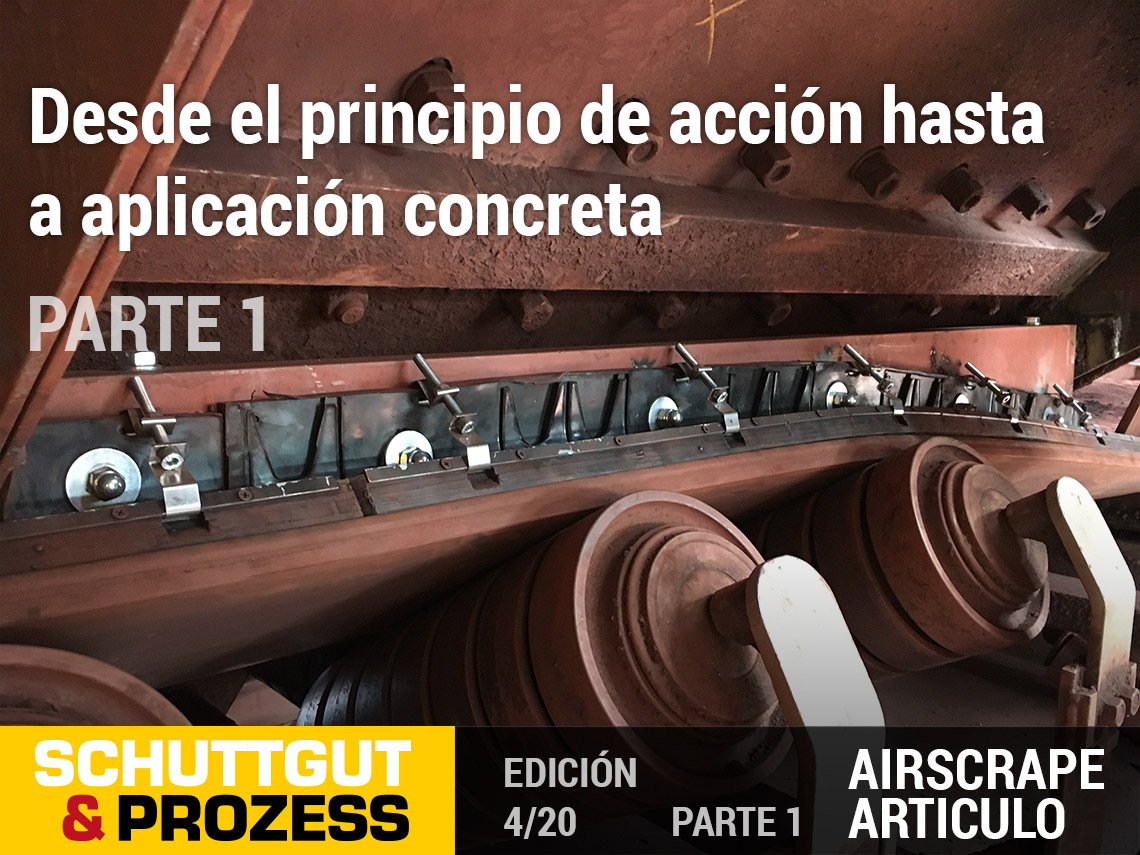 El AirScrape es un sistema patentado de faldón lateral para cintas transportadoras fabricado en Alemania, que se utiliza en todo el mundo desde hace aprox. siete años. Los elementos del AirScrape funcionan sin contacto y se colocan lateralmente en las zonas neurálgicas de las cintas transportadoras. La estructura especial y el hueco que se deja expresamente abierto, ajustado con precisión en cada caso, entre la superficie de la cinta y el innovador faldón lateral, son decisivos para el funcionamiento óptimo. Siguiendo las leyes de la física, una cinta cargada y en marcha genera una ligera estela de aire. Las láminas diagonales del AirScrape, orientadas en el sentido de la marcha, actúan como refuerzo eficaz de la corriente de aire. Dado que este innovador faldón lateral flota sobre la superficie de la cinta a una distancia definida y sin entrar en contacto, se puede aprovechar el denominado efecto Venturi: el aire del exterior se aspira hacia el centro de la cinta. Esto provoca una presión negativa en la zona de transporte de la cinta. Las partículas de polvo y de material fino no pueden contrarrestarla y permanecen forzosamente en la zona de transporte. Aunque el material grueso impulsado hacia fuera puede superar esta fuerza de aspiración, es conducido eficazmente por las láminas, que hacen que regrese al centro de la cinta.