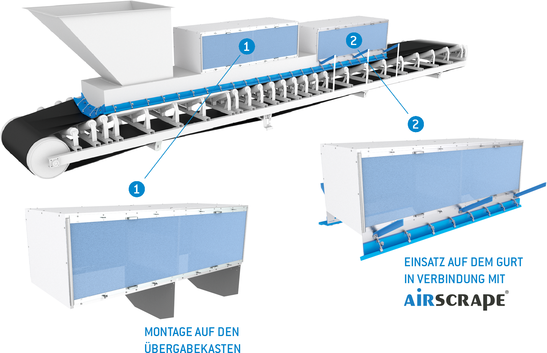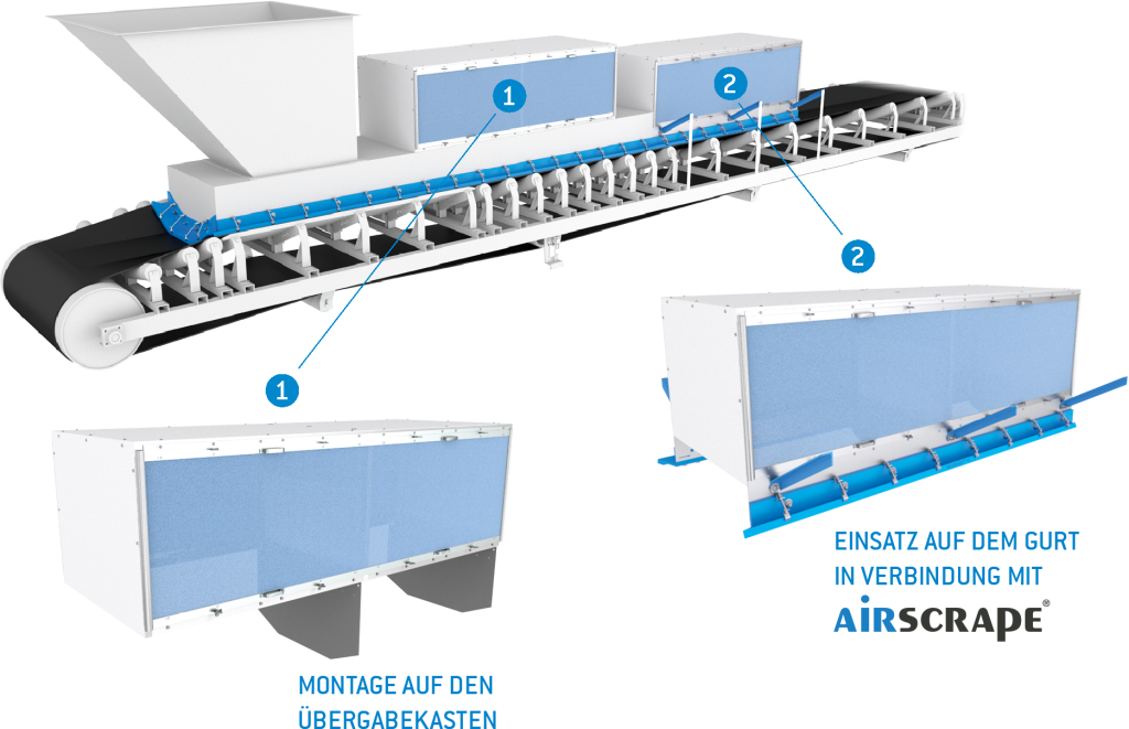 Die AirScrape-Seitenabdichtung und die DustBox bilden gemeinsam das DustScrape-System. Der AirScrape sorgt dafür, dass kein Staub oder feines Material nach Außen gelangen. Zudem bewirkt die Anordnung der Lamellen, dass grobes Material in die Bandmitte zurückgeschoben wird und so Verschüttungen komplett vermieden werden. Das kontaktfreie Prinzip schont die Seitenabdichtung und den Gurt und macht Wartungsintervalle überflüssig. Die DustBox sorgt mit ihrem speziellen Filtertuch dafür, dass Material und Staub in der Beruhigungszone gehalten werden und lässt überschüssige Luft durch die Poren entweichen. Entstehender Druck wird so abgebaut. Aktive Entstaubungen oder mit aufwändigen Umbauarbeiten verbundene Vergrößerungen der geschlossenen Beruhigungszone werden überflüssig.